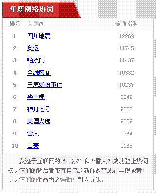 年度網(wǎng)絡(luò)熱詞排行榜中,“四川地震”、“奧運(yùn)”和“艷照門”成為2008年網(wǎng)友最關(guān)注的三大事件,分列該榜單前三甲。而發(fā)跡于互聯(lián)網(wǎng)的“山寨”和“雷”也成功入選年度十大網(wǎng)絡(luò)熱詞,與以往網(wǎng)絡(luò)流行詞所不同,它們的背后都帶有自己的新聞故事或社會(huì)現(xiàn)象背景,生命力之強(qiáng)勁更耐人尋味。