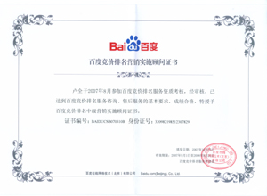 鹽城思科網(wǎng)絡工程有限公司作為百度鹽城地區(qū)總分銷商,在2007年度參加百度競價排名服務資質(zhì)考核中,經(jīng)過公司全體員工們的共同努力,再創(chuàng)佳績,其中通過中級服務認證考核8人,3人優(yōu)秀,通過率達95%,被全球最大中文搜索引擎——百度在線(北京)有限公司再次授權(quán)百度競價排名鹽城地區(qū)唯一客戶服務中心。盡善盡美的售后、全心全意的服務,思科人將用十二分的熱忱等待您的惠顧,共創(chuàng)新紀元!