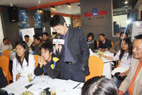 秋高氣爽,舒適宜人。2008年10月24號(hào)下午,“營(yíng)銷(xiāo)加速度”——百度營(yíng)銷(xiāo)專(zhuān)家培訓(xùn)會(huì),在美麗的丹頂鶴之鄉(xiāng)鹽城拉開(kāi)了帷幕。在思科百度商務(wù)會(huì)所里,客戶(hù)們齊聚一堂,氣氛甚是融洽。本次會(huì)議真可謂陣容強(qiáng)大,百度客服部經(jīng)理張鵬先生與百度渠道部經(jīng)理晟皞先生兩大經(jīng)理齊上陣,再加上思科資深網(wǎng)絡(luò)營(yíng)銷(xiāo)專(zhuān)家、客服部經(jīng)理盧全女士精彩而實(shí)用的演講,現(xiàn)場(chǎng)客戶(hù)個(gè)個(gè)大飽耳福,獲益非淺。會(huì)議開(kāi)場(chǎng)主持人帶領(lǐng)大家玩默契火拼游戲,破冰熱場(chǎng),大家玩得不亦樂(lè)呼!短暫的游戲后,與會(huì)嘉賓都專(zhuān)心致志的聽(tīng)著張鵬經(jīng)理、盧全經(jīng)理精彩的演講。在有獎(jiǎng)問(wèn)答環(huán)節(jié),客戶(hù)們更是奮勇?lián)尨?,把整個(gè)會(huì)議推向了高潮。